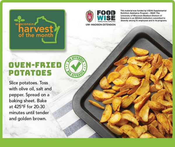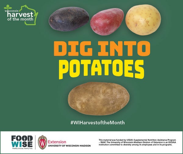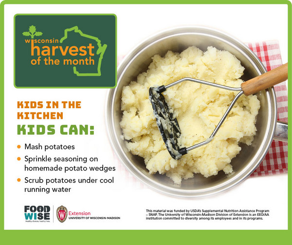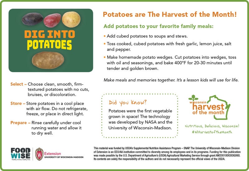 Dig into Potatoes for December’s Harvest of the Month! Potatoes have been grown in the Peruvian Andes Mountains of South America since 5000 B.C. Peru is still considered the potato capital of the world, and they grow a wide variety of potatoes. There are more than 1,000 varieties of potatoes grown around the world and more than 100 varieties are grown in the United States. Did you know that potatoes were the first vegetable grown in space! And, the technology was developed by NASA and the University of Wisconsin-Madison! Potatoes have three key nutrients that help our bodies stay healthy in different ways. These include Vitamin B6 which is important for your immune system and brain function and helps you get energy from your food. The Vitamin C found in potatoes helps wounds heal, is also important for the immune system, and is an antioxidant, which protects our cells from damage. And they have potassium which helps maintain normal blood pressure. Try adding cubed potatoes to soups and stews, toss cooked, cubed potatoes with fresh garlic, lemon juice, salt and pepper for a fun new twist, or make homemade potato wedges! Simply cut potatoes into wedges, toss with oil and seasonings, and bake 400° for 20-30 minutes until tender and golden brown. Dig into Potatoes for December’s Harvest of the Month!