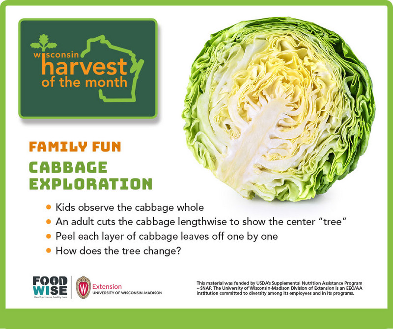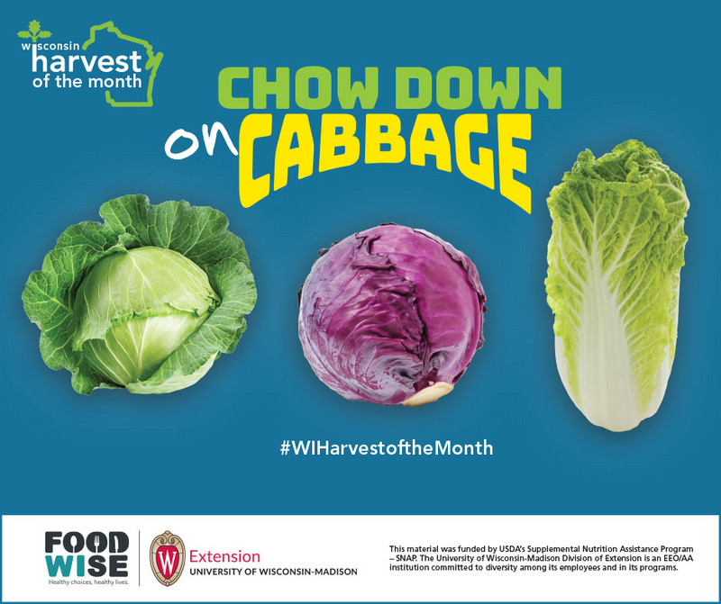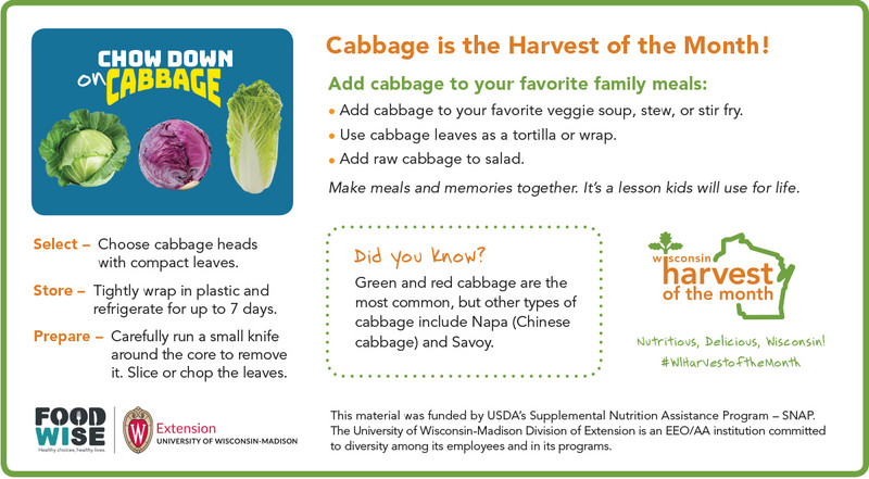 This month’s Harvest of the Month is Cabbage! Cabbage can be green or red in color. Cabbage has many different benefits such as helping our wounds heal and it supports our immune system! You can add cabbage to your favorite vegetable soup, stew, or stir fry. You can use cabbage leaves as a tortilla or wrap. You can also toss some raw cabbage into your salad! Enjoy cabbage this month and explore new foods!